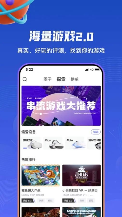 海量的玩家分享内容,专业的VR游戏资讯,真实的游戏评价推荐,你可以在这里获得客观,中肯的全方位信息,覆盖画面、音效、趣味、舒适度、沉浸感,不再错过身边的优质VR体验。