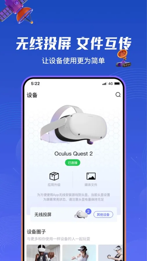 绑定VR设备,无线推送内容到VR设备,轻松分享头显中的视频、截图到87VR社区。
