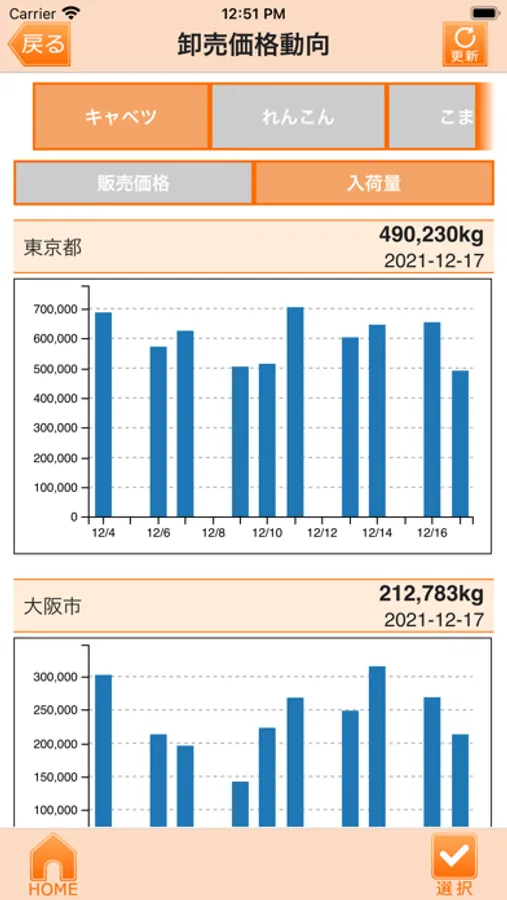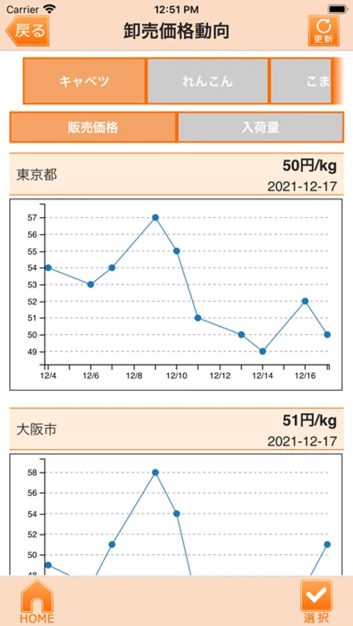 日本主要都市15カ所の中央卸売市場における、過去10日分のデータをグラフ化して表示します。
