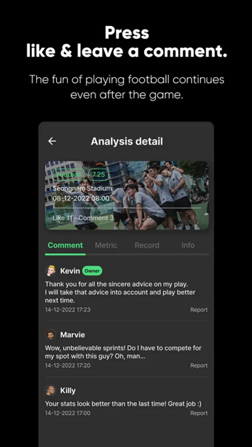 - Distance covered, top speed, number of sprints, heat maps, and more are available right after the game.