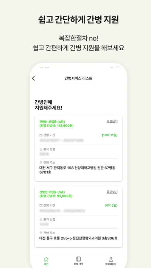 간병 일자리를 찾는 분들이 자신에게 맞는 간병 일자리를 찾는 앱입니다.