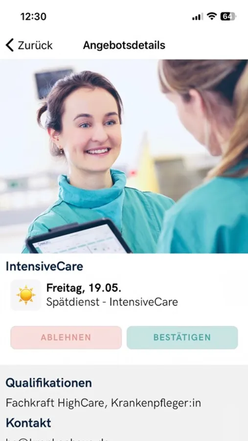 Die im Portal vom/ von der Administrator:in ausgeschriebenen Schichten können von den Mitarbeiter:innen per App empfangen werden und per Klick angenommen oder abgelehnt werden.