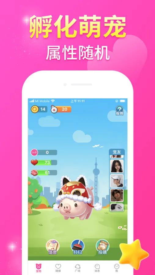 摸摸交友APP是一款原创虚拟宠物游戏化真人社交APP,孵化可爱萌宠,和帅哥美女们一起溜溜宠物,聊聊天。为你的脱单增添乐趣,陌生人交友不再尬聊,化解尴尬!!