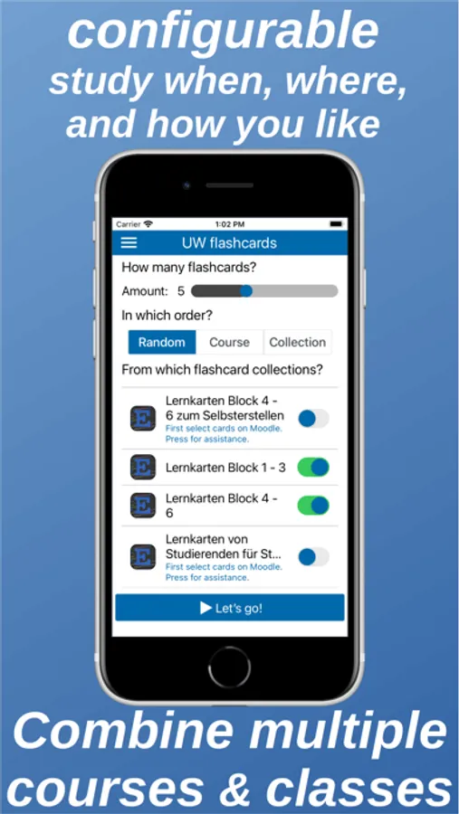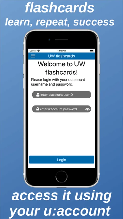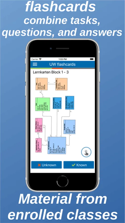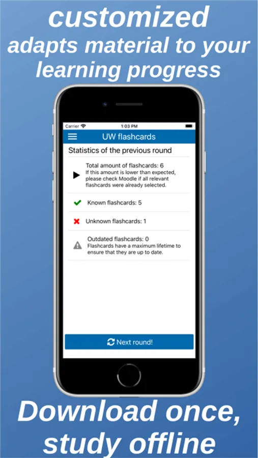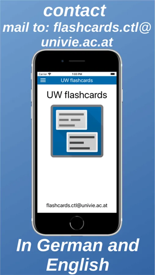 The UW flashcards app is the mobile counterpart to the University of Vienna Moodle (http://moodle.univie.ac.at/) flashcards functionality. It permits to learn flashcards on the go and (after an initial data download) even without an Internet connection. Learning results are synchronized with the Moodle server after each learning session. The latter enables Moodle to dynamically determine which flashcards should be viewed by individual students in the following learning rounds to maximize learning success.