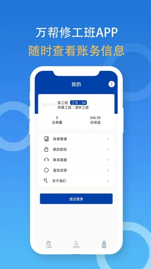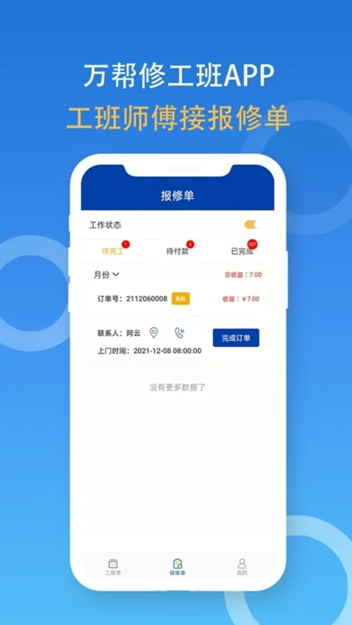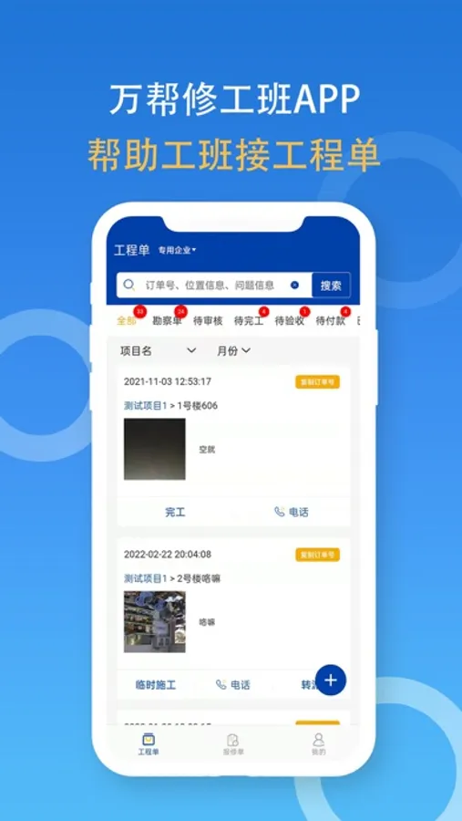 万帮修工班管理系统:工班负责人、工班师傅、工班成员各自权限的管理订单相关状态的处理权限;工程订单管理和收益统计等功能,实现工程相关的订单与收益各个环结的管理与操作执行功能。