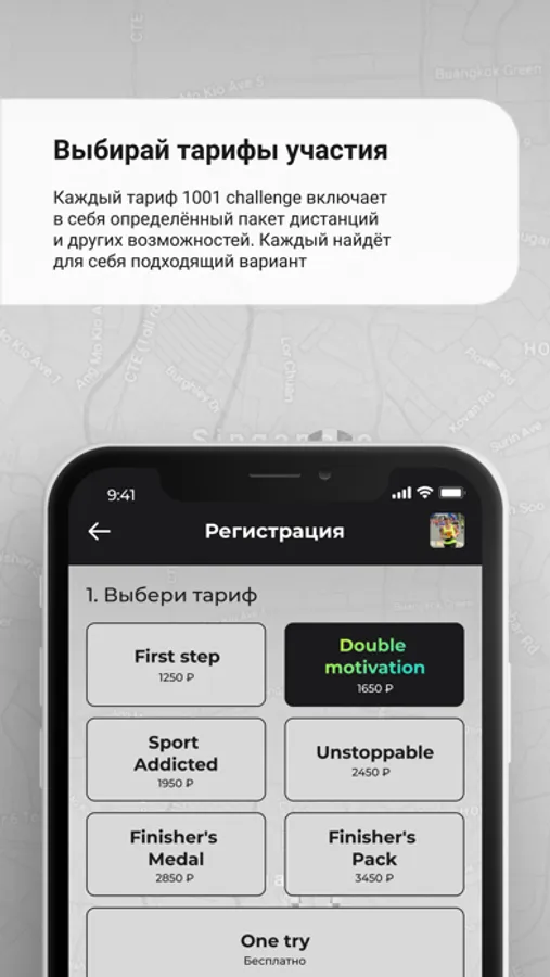Для участия в челлендже необходимо на него зарегистрироваться. Для регистрации в челлендже необходимо выбрать один из семи тарифов и выбрать дистанции. Один бесплатный тариф "One Try" дает возможность зарегистрироваться на одну дистанцию челлнджа и дает возможность загрузить результат только один раз. При выборе тарифа категории Unlimited можно загружать каждую новую тренировку, которая лучше предыдущей, тем самым улучшая свою позицию в рейтинге. Тарифы категории Unlimited отличаются число дистанций, на которые ты сможешь зарегистрироваться.