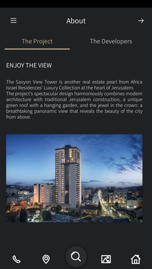 Using this app, you can get a three-dimensional experience of the project. The app allows you to get data about the requested apartment according to filters of size, price, location and more ... and go through a 360 virtual tour inside the apartment and the external project environment.
