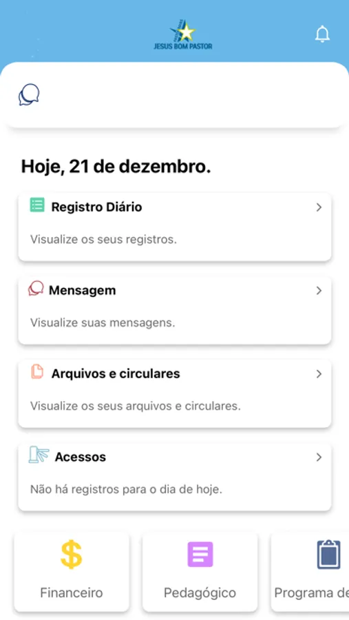 • Consulta ao registro diário para os pais acompanharem a rotina do estudante como alimentação, higiene e sono.
