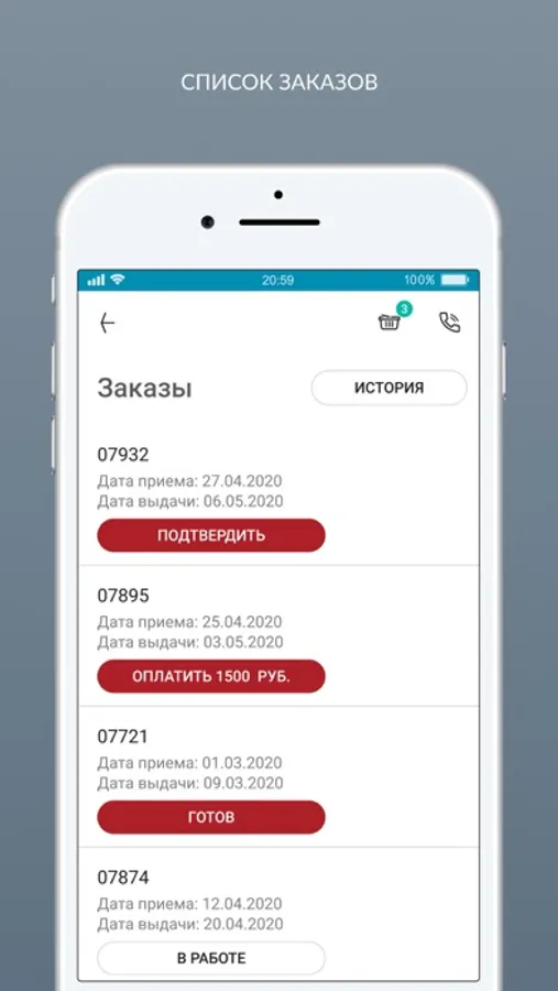 - посмотреть свои заказы в работе, их статусы, историю заказов;