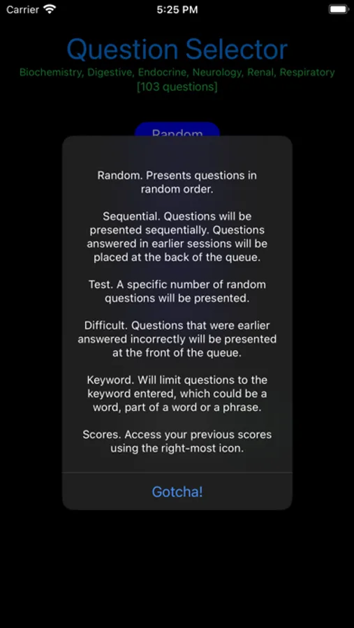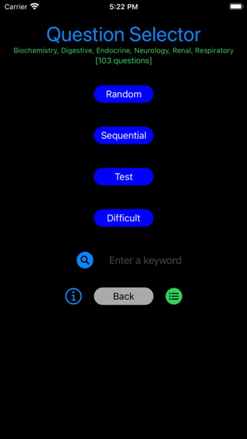 Keyword mode. Presents questions that match a keyword (within the question text)