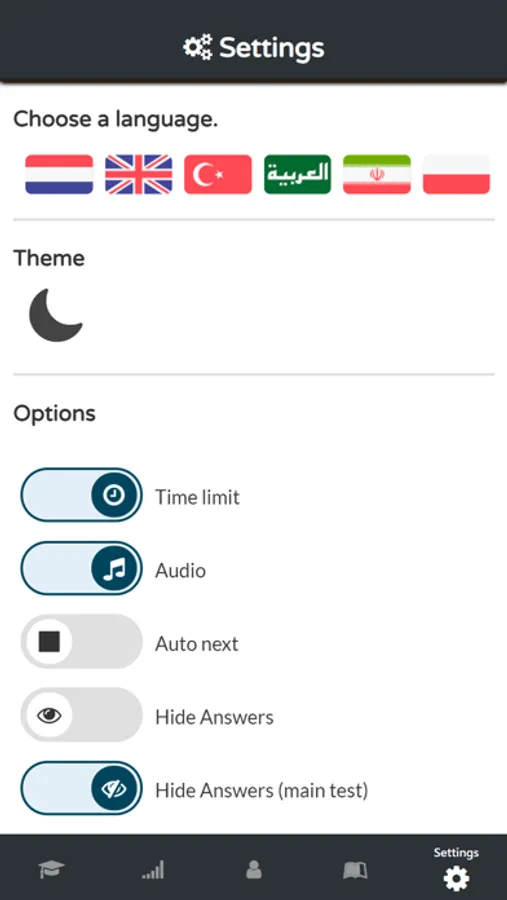 Press the flag in the settings to switch to English, Dutch, عربى, Türk, فارسی or Polskie.