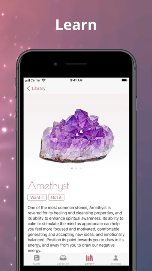 * Explore dozens of crystals, each with insight into its underlying properties, including associated chakras, zodiacs, colors, and more