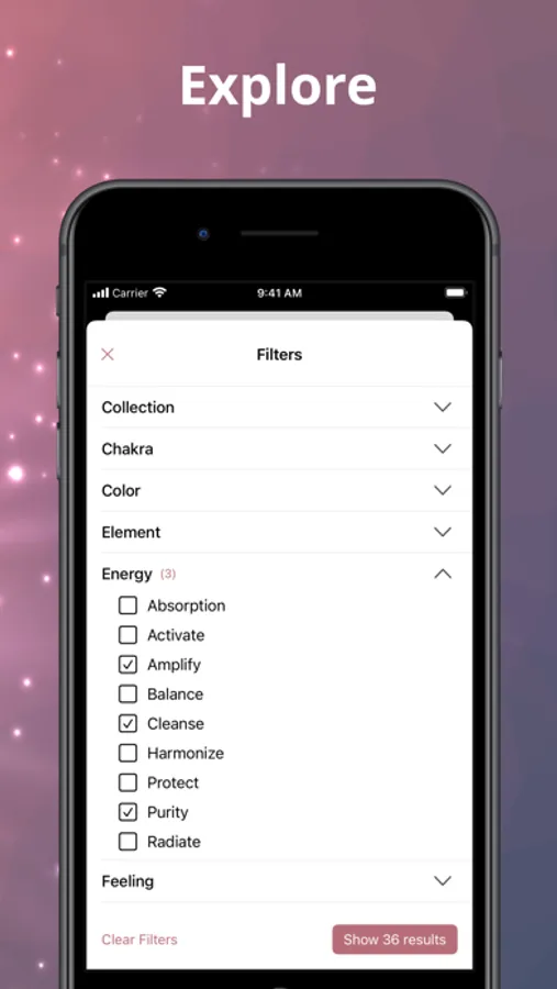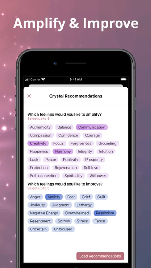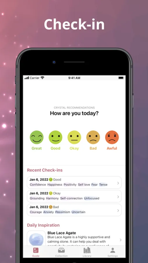 * Check-in with the app to receive crystal recommendations based on feelings you would like to improve and/or amplify
