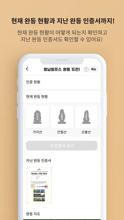 - 9개 산 등반 인증사진을 모두 등록하면 '인증서 신청' 이 활성화되어 바로 완등 신청할 수 있습니다.