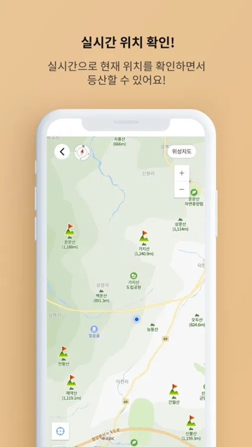 - '내 위치 확인'에서 등산 지도 위에서 현재 사용자의 위치가 표시됩니다.