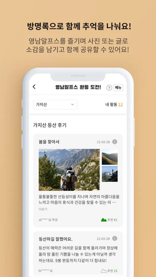 - '방명록'에서 다른 관광객과 나누고 싶은 영남알프스 산행 이야기나 실시간 등산 정보를 나눌 수 있습니다.