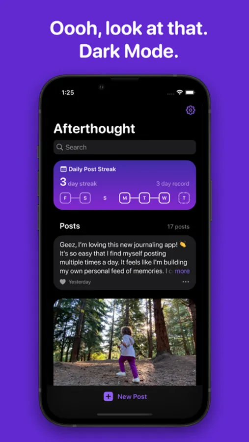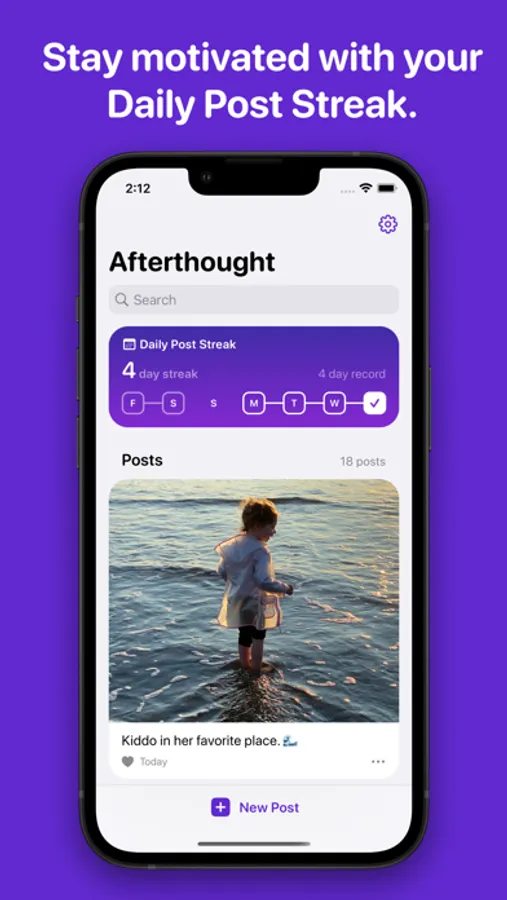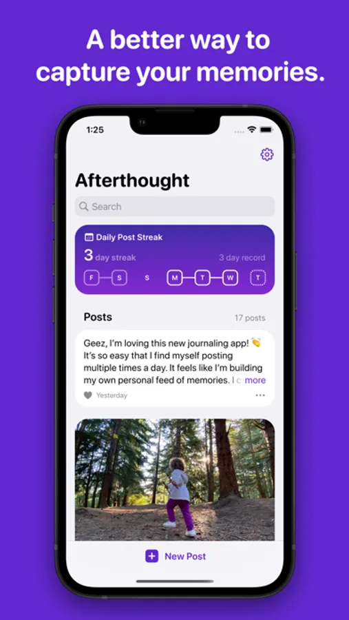 Make journaling feel effortless and familiar. Afterthought helps you build a personal feed of memories. Posting is easy so you can capture a moment in seconds.