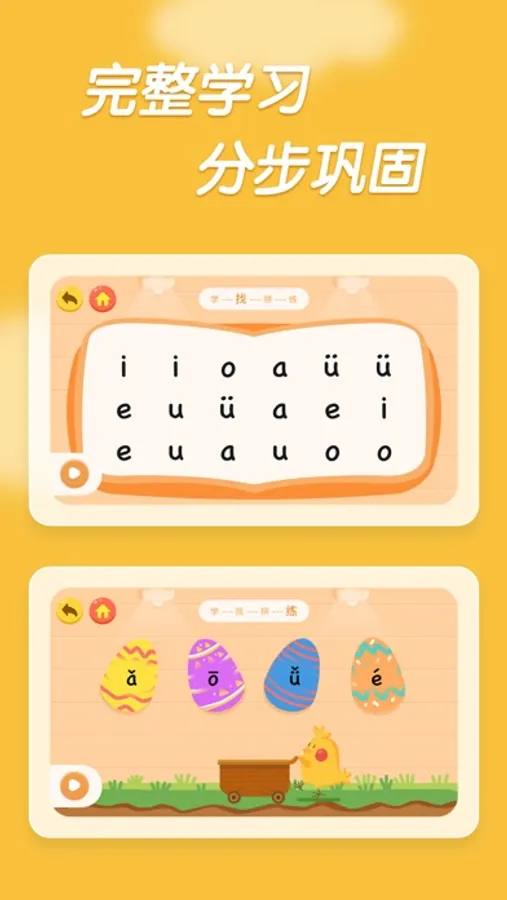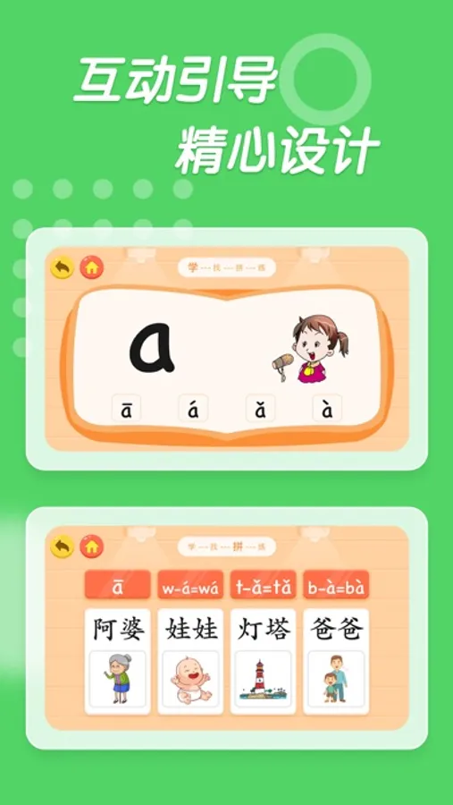 通过动画分步展示,配以对应的拼音练习,让小朋友循序渐进掌握拼音知识。