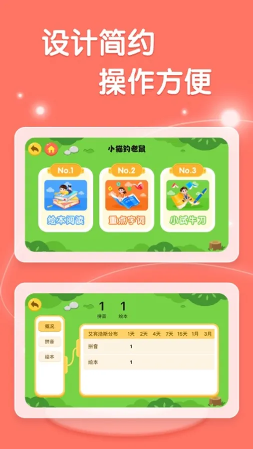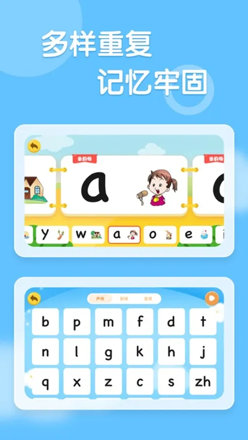 拼音卡和拼音库模块帮助小朋友快速复习巩固拼音知识。