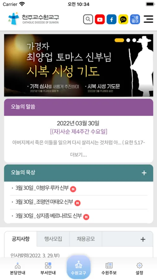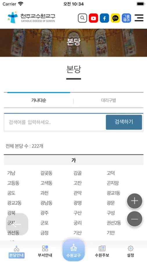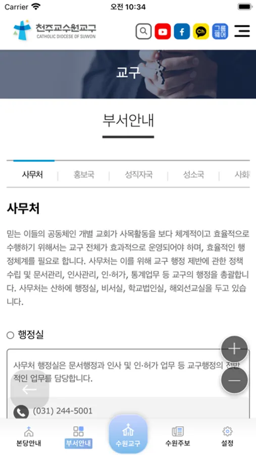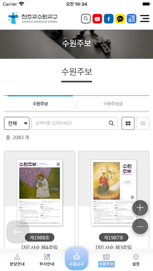 교구소개, 교구사제, 본당, 교구 내 성지, 수원주보, 교회 및 교구 소식, 교구 간행물, 자료 등