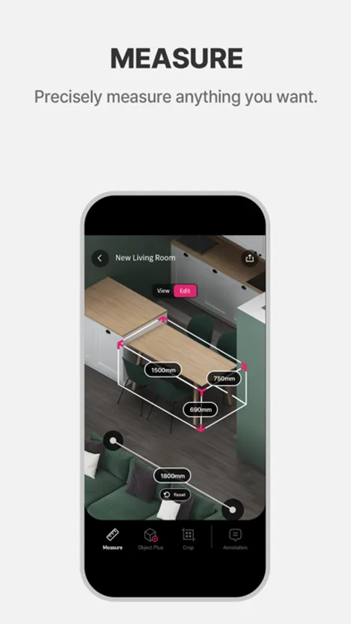 • Measure(Measuring Tool): Automatically measure any object or the entire space and easily measure the starting point to the ending point.