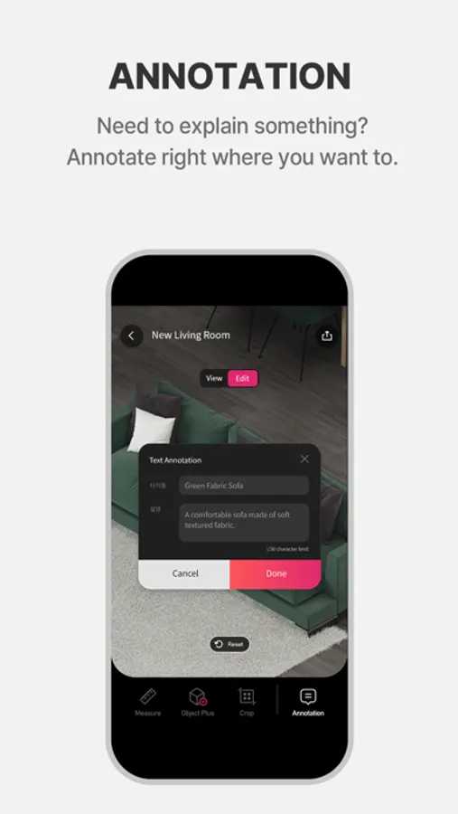 • Annotation: Allows users to select an object or area that needs description, providing a tool to insert texts, images, videos, or URL links.