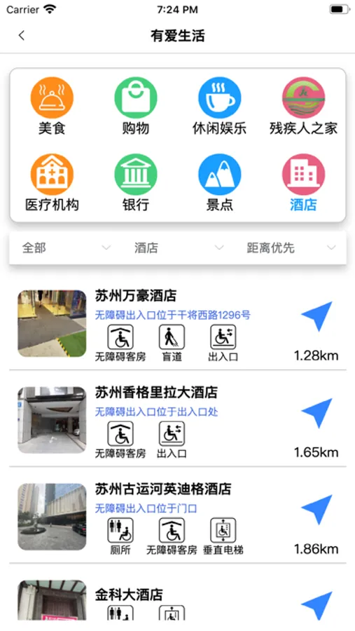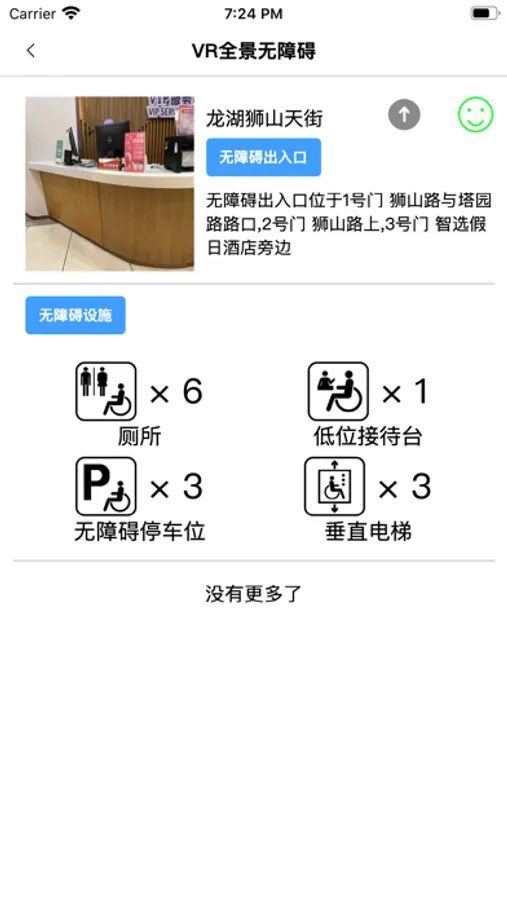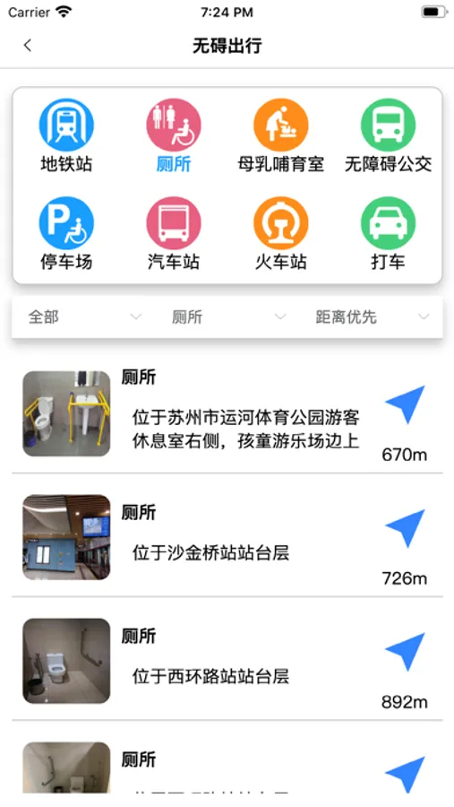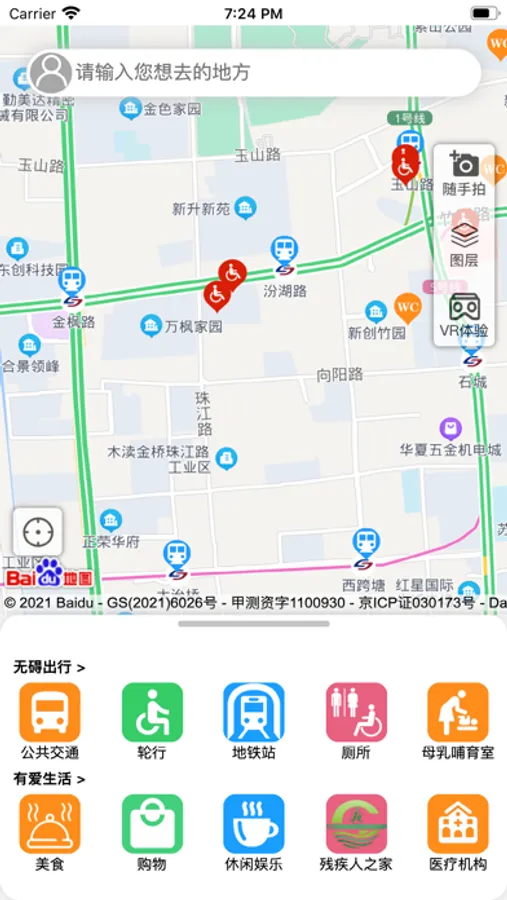 通过本平台查找指定地点,即可获取该区域或地点的无障碍设施详细情况及周边无障碍设施分布情况,例如地铁站、交通枢纽、购物中心、行政服务中心等地点的无障碍设施。