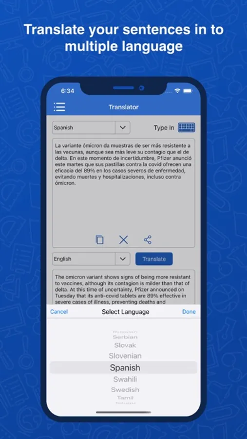 6- There is a feature in our app that you will not find in any other app is- Users can write the sentences in the selected language and translate them into the other selected language also they can copy and share the translated text with anyone.