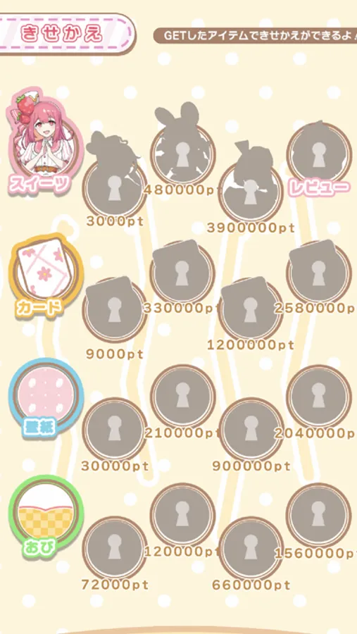 スイーツや壁紙などの着せ替えがゲットできるよ!