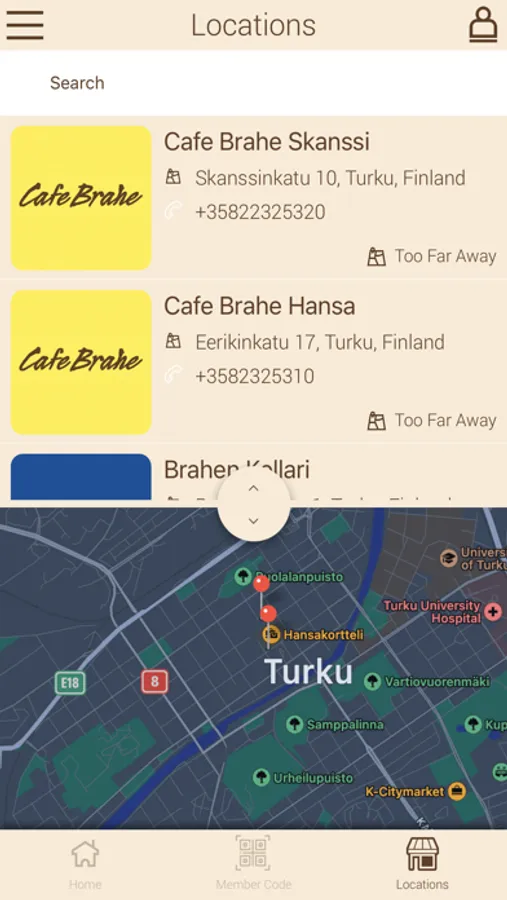Sovelluksella voit personoida Cafe Brahe Kahvilat ja osallistuvat ravintolat (lähiaikoina Brahen Kellari):