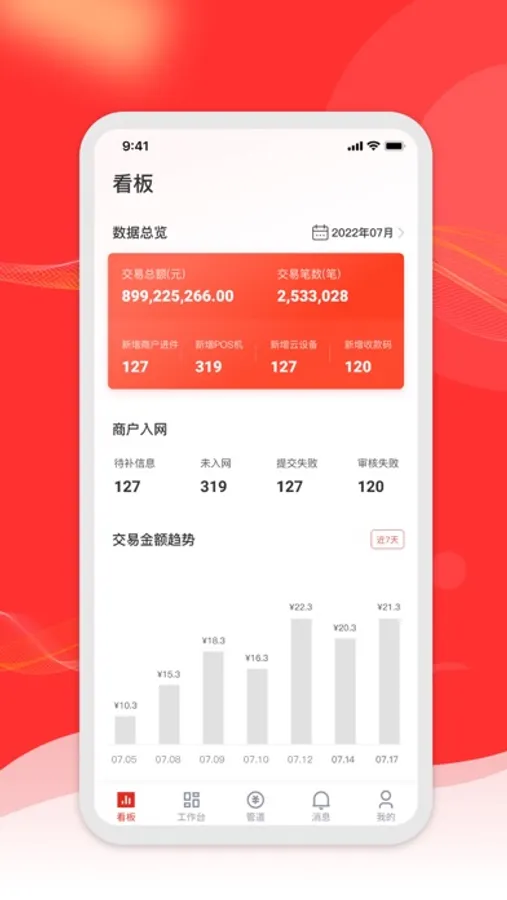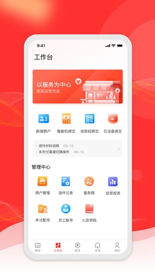 火店宝管家为旗下全国服务商人员提供移动化业务协作平台,包括商户登记、进件申请、设备服务、管道收益、数据看板等展业服务。