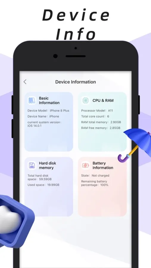 - Device detection: basic information, CPU and RAM, hard disk memory, battery information and other detailed data.
