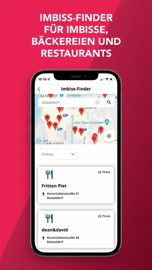 Unser Imbissfinder navigiert Sie direkt zum nächsten Imbiss, Restaurant oder Bäckerei