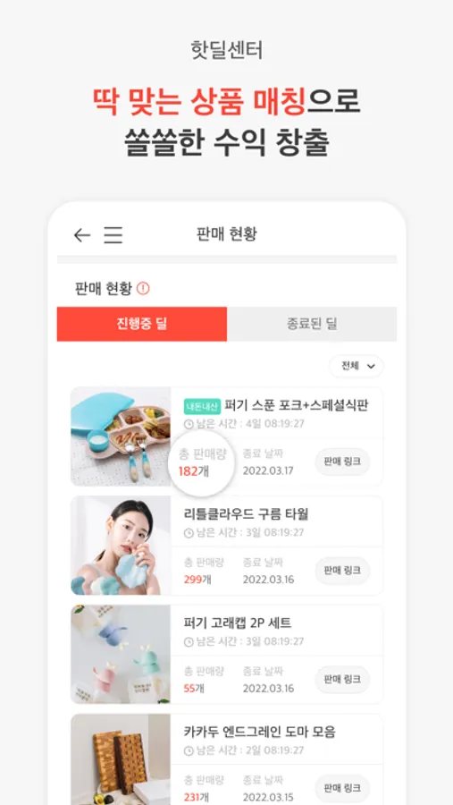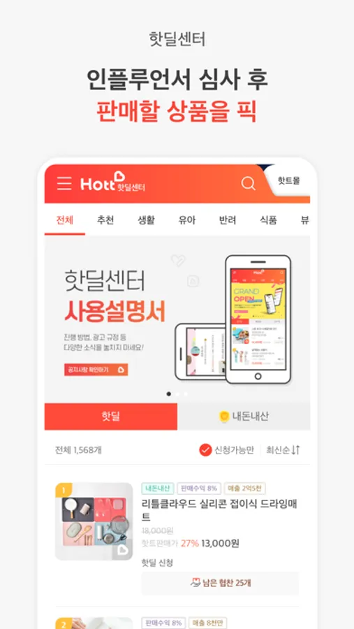 인플루언서 심사 후 원하는 상품을 핫딜 신청하면 판매 준비 끝! 1개만 팔아도 수익을 드려요.