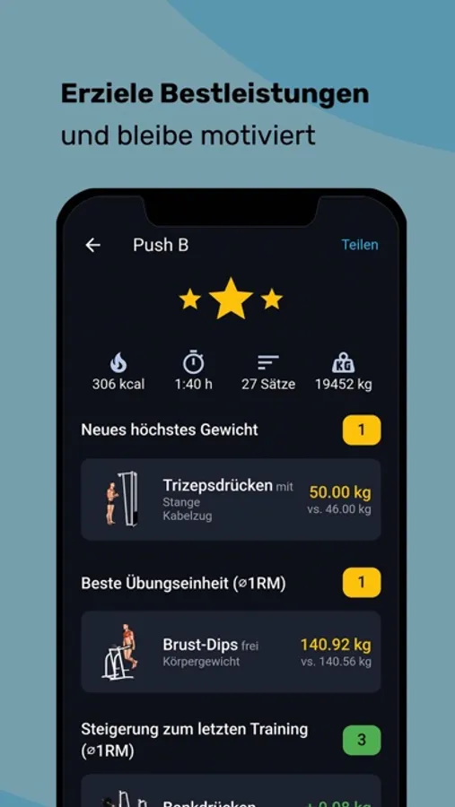 Erhalte Progressionsempfehlungen, basierend auf deinen bisherigen Leistungen, um dich von Woche zu Woche zu steigern und effektiv Muskeln aufzubauen.