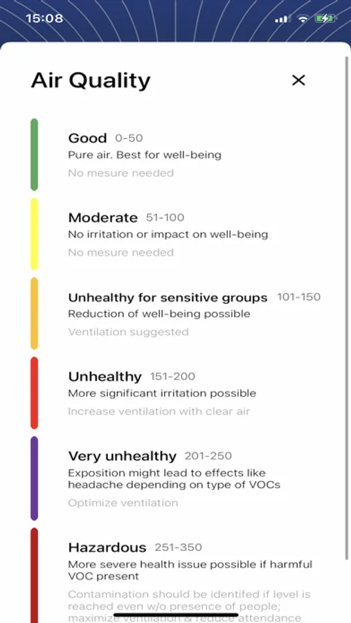 By clicking on the AQI information box, you can access to the information of the different AQI levels, which follows the generally accepted environment quality criteria levels considered by the EPA (Unites States Environment Protection Agency). The app also provides you with information on the time left to change the filters.