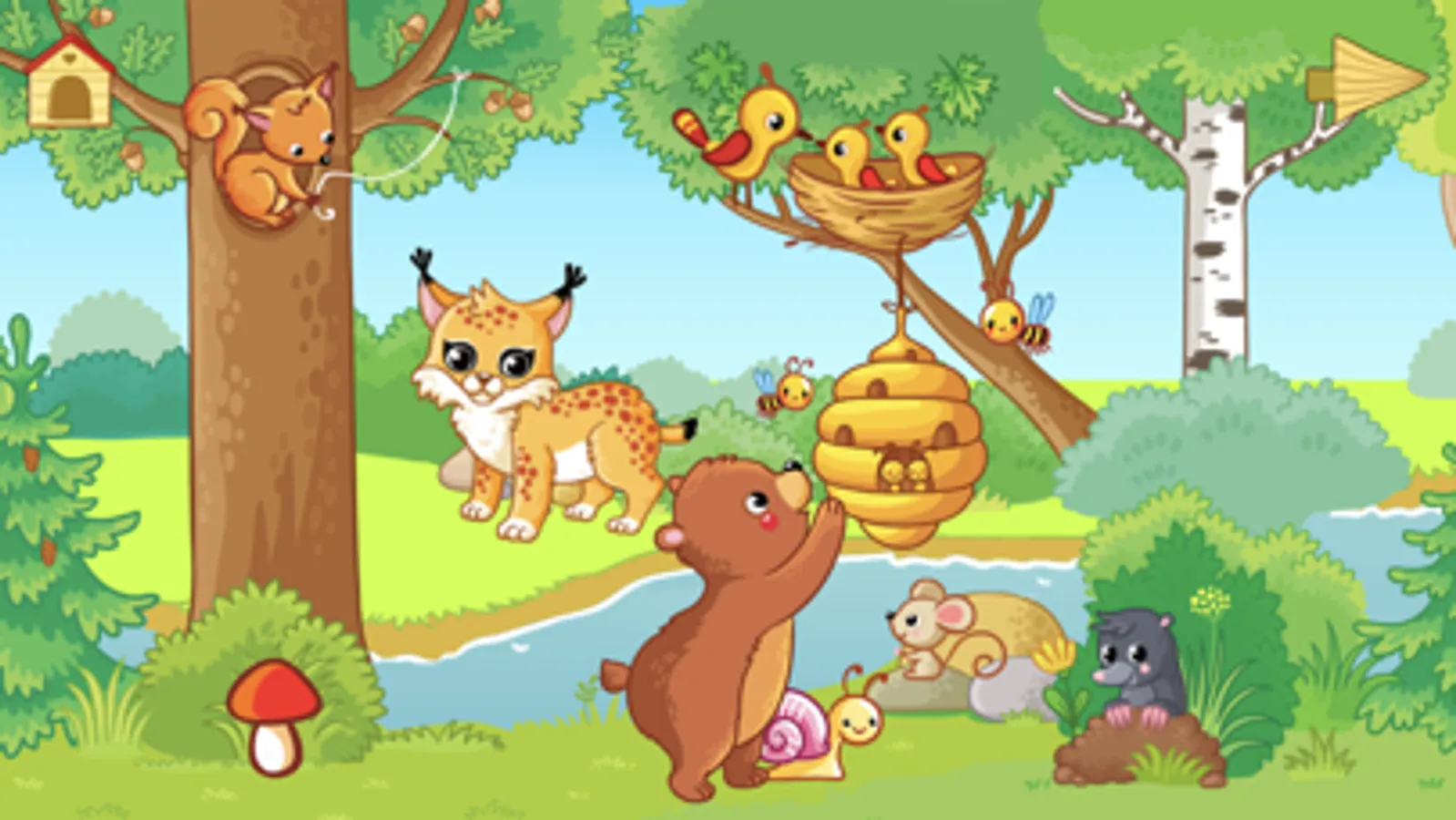 8. FOREST WITH BEES: bees, bear, lynx, mouse, bird with chicks, squirrel, mole, snail.
