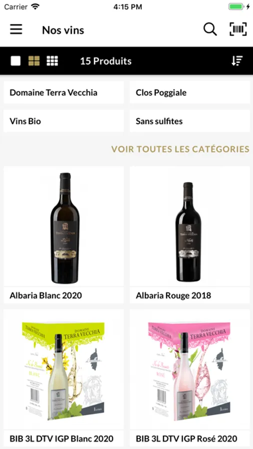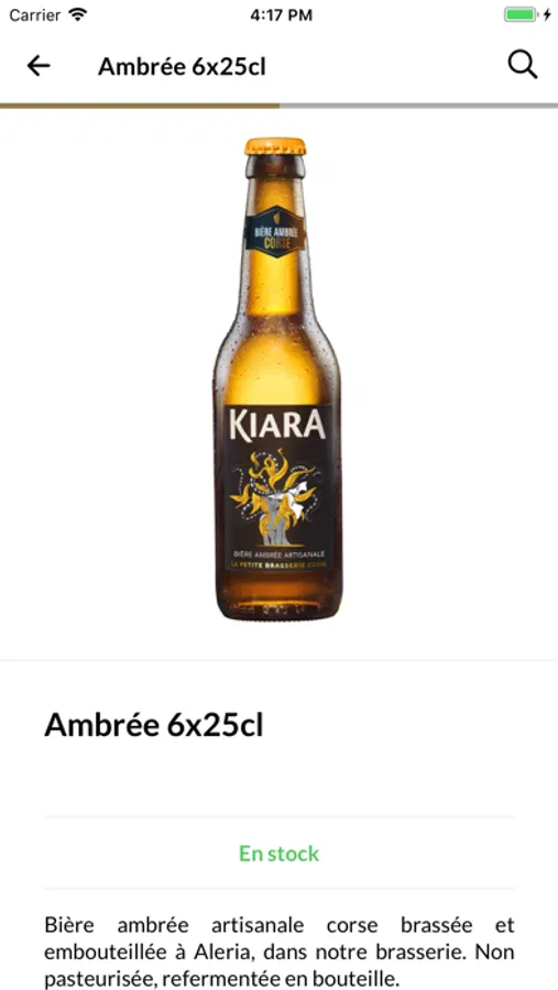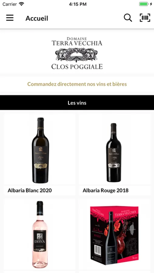 Produits disponibles : vins Domaine Terra Vecchia, vins Clos Poggiale, bière corse artisanale Kiara