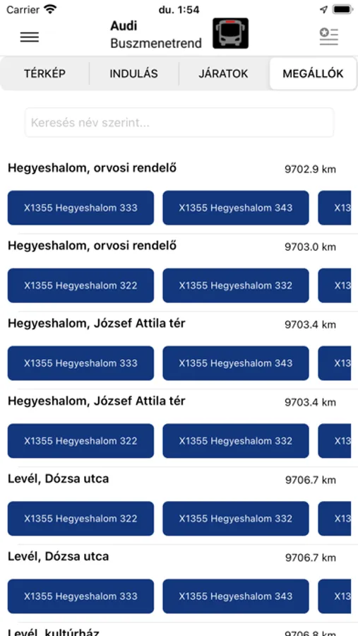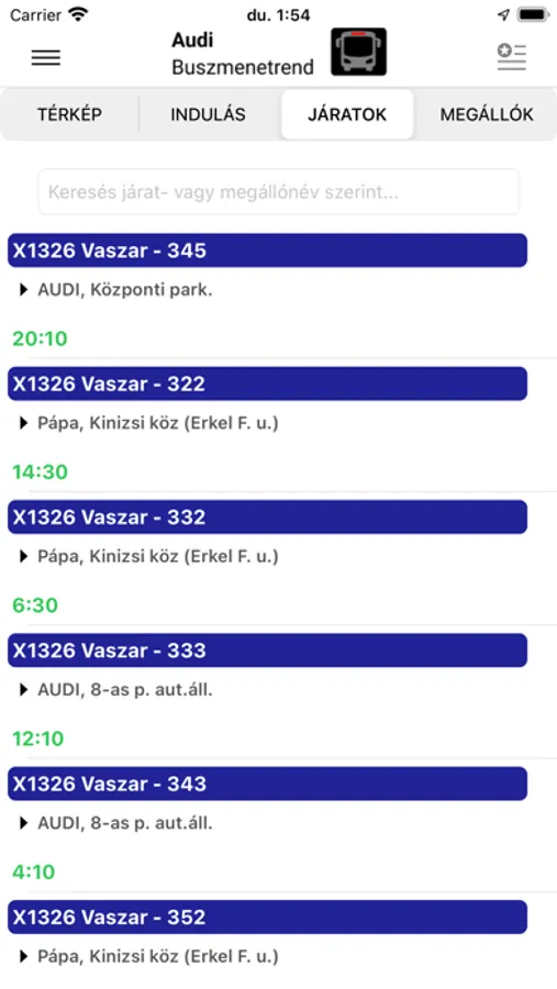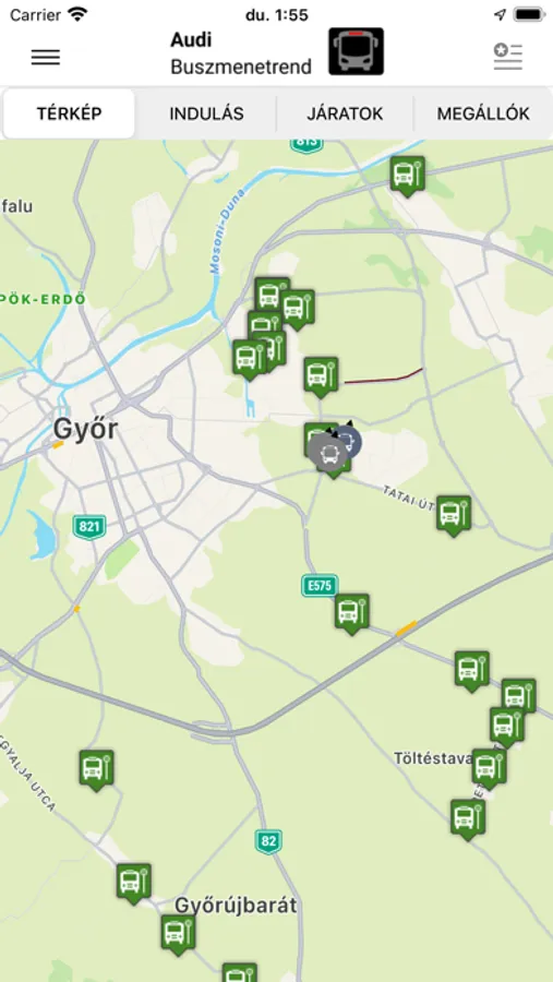 Az alkalmazás az Audi gyárhoz közlekedő buszok menetrendjét tartalmazza. Látható a buszok pillanatnyi helyzete, valamint a megállóba érkezés becsült időpontja.