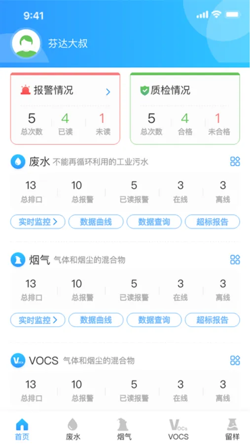 监测展示环境数据,可查看废水、烟气、VOCS的各类数据。