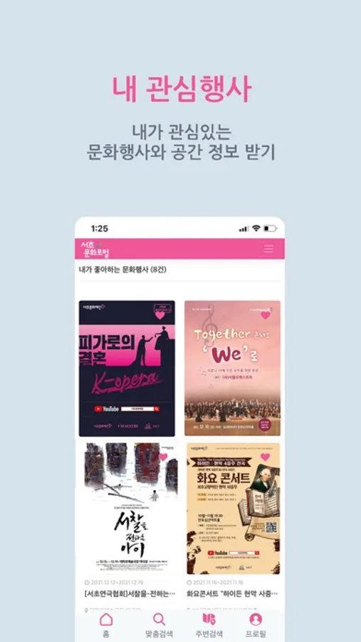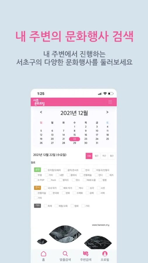 서초문화포털은 서초구민의 편의를 위해 관내의 문화행사와 문화공간을 소개하고 있습니다.