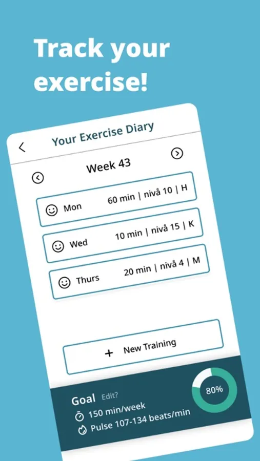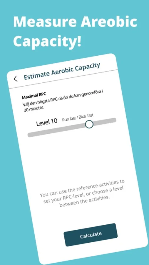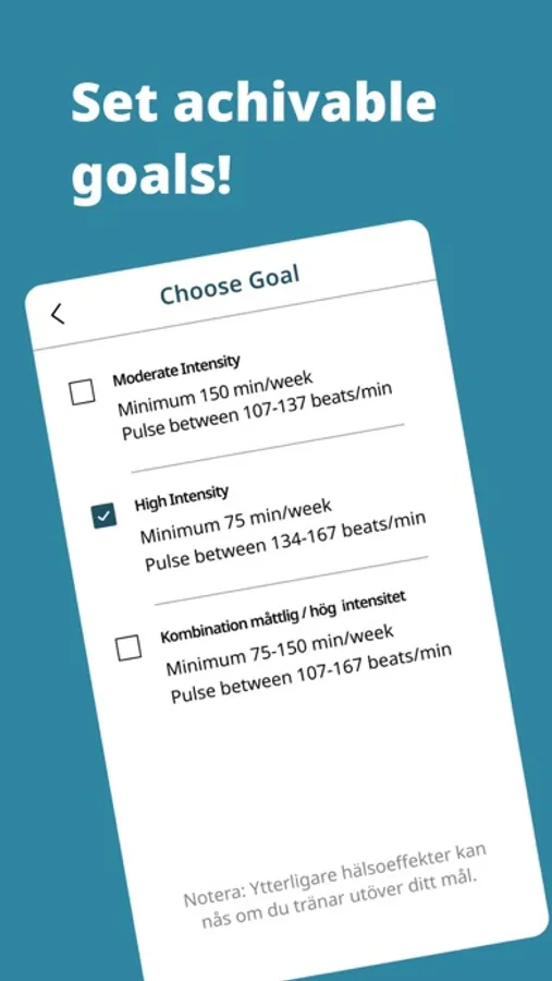 In this application, you get a quick idea of your aerobic capacity via the rating scale RPC (Rating of Percieved Excertion). You will also receive information about which pulse rate intervals you should train within to stay in good health. You have the opportunity to use the app as an exercise diary, where you set goals based on your fitness and based on the recommendations for physical activity that are available, and where you can follow up your training.