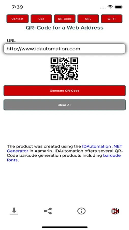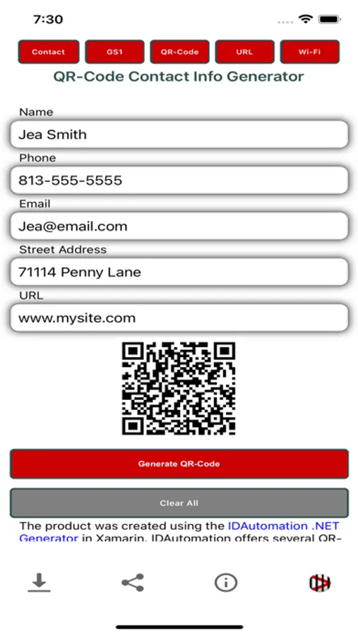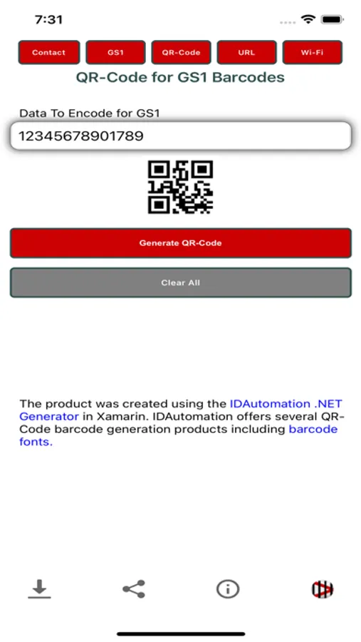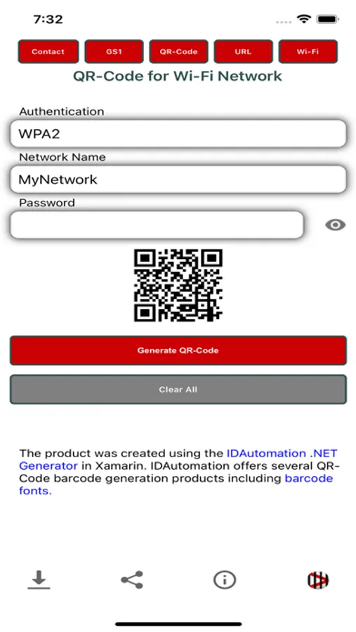 Easily Generate QR-Code symbols that contain your Contact Information like a digital business card. This app also generates QR-Codes for Wi-Fi Auto-Connect, URL Website Redirection, and GS1 Data. Symbols generated may be saved or shared. This app was created using the IDAutomation .NET Generator in Xamarin.