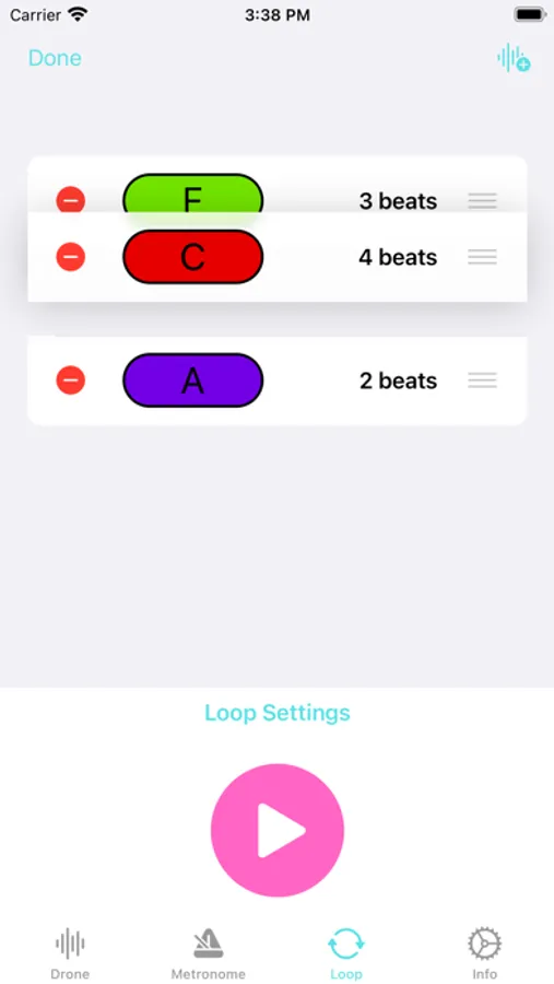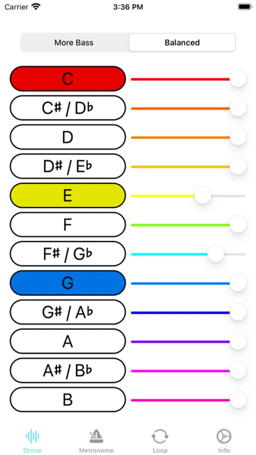 PedalTone is a simple drone application for use in intonation practice! Play and balance multiple drones at once, add a metronome to keep your rhythm in check, and loop through sequences of drones for modulating passages.
