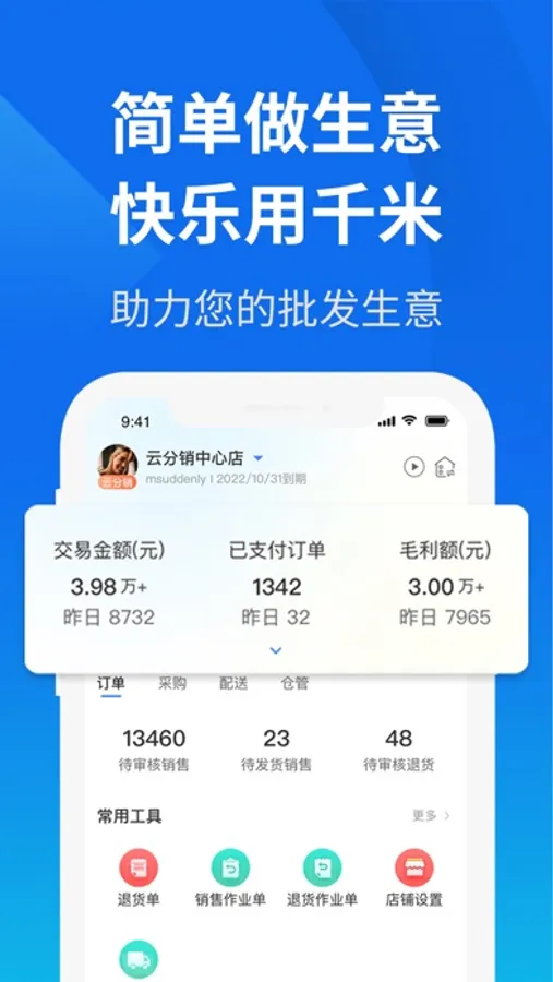 云分销商户端,是由江苏千米网络科技有限公司推出的一款为分销批发行业的商户提供的APP。通过APP可快速注册登陆成为云分销商户后即可享受,移动上架商品、一键处理订单、库存同步处理,支持业务员外勤轻松完成陌拜与客勤维护,多维度数据分析,员工业绩随时在线查看,店铺经营更高效。