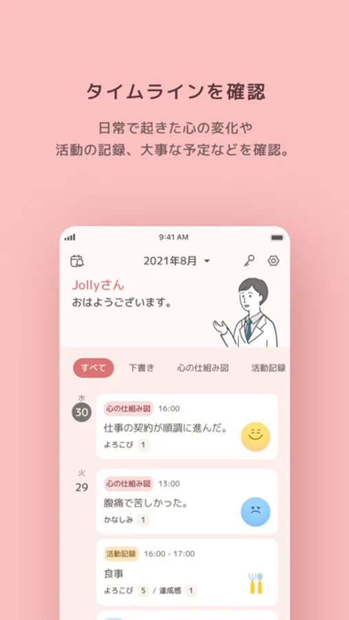 日々の活動や心の変化の記録を通して、自分の状態や傾向を把握することができます。