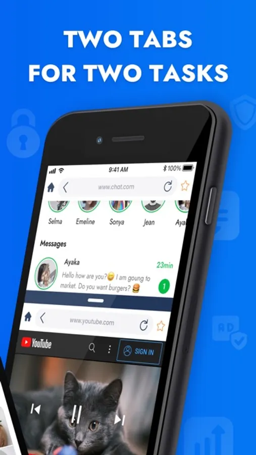 Don't switch between tabs: watch videos and use social network simultaneously. Split the screen into two, add your favourite sites, download and play videos offline.