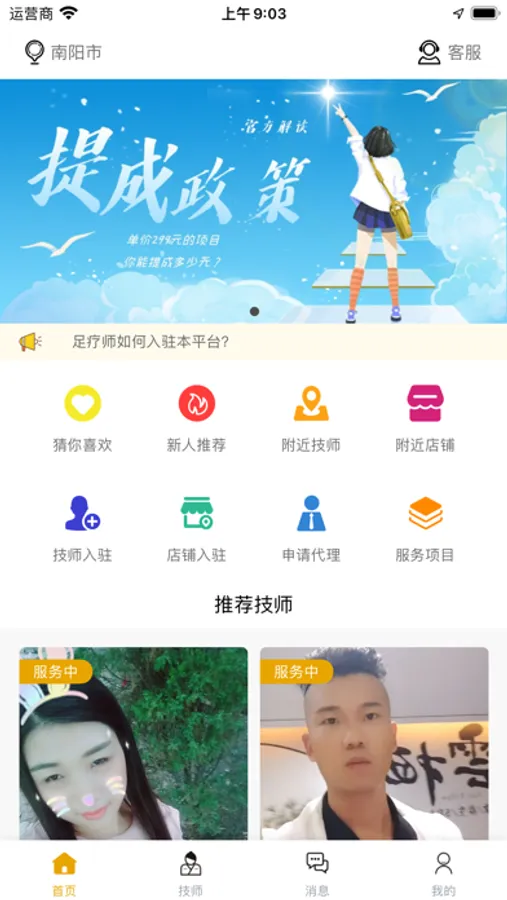 技师入驻:足疗师可自主入驻平台,通过人工审核、培训后,每单均可享受最低60%的提成收益分配。且技师可根据自己实际情况自主选择接单时间、接单情况。
