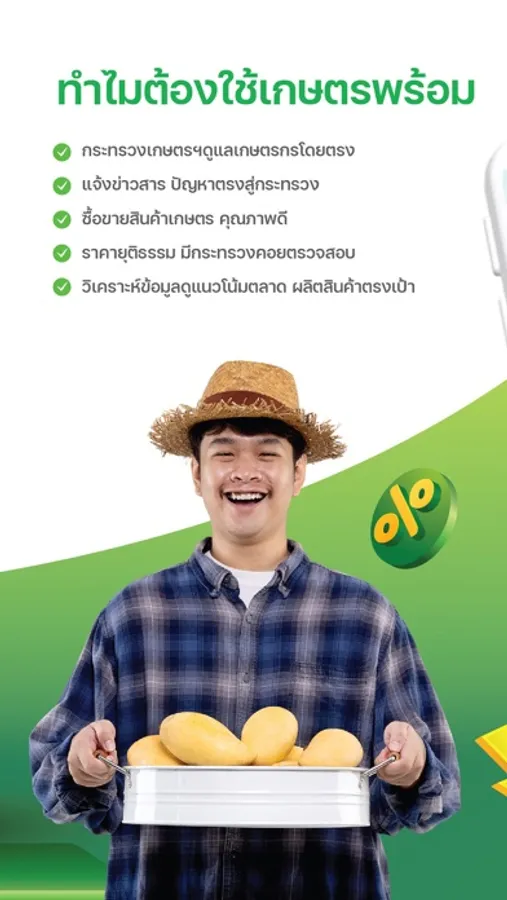 แพลตฟอร์มเกษตรพร้อม เพื่อให้เกษตรกรสามารถบันทึกข้อมูลการทำเกษตรกรรมด้านต่างๆ เป็นประโยชน์ในการประเมินคุณภาพการผลิต และพยากรณ์ผลผลิตที่จะออกสู่ท้องตลาดได้ ทำให้เกษตรกรผลิตออกมาได้ตรงความต้องการของตลาด เพิ่มรายได้ให้เกษตรกร และยังช่วยเหลือการซื้อขายผลผลิตผ่านทางออนไลน์ ในราคาที่เป็นธรรม อีกทั้งยังมีส่วนของห้องสมุดความรู้ให้เกษตรกรพัฒนาทักษะการเกษตรให้ผลิตได้มีประสิทธิภาพได้ดียิ่งขึ้นและมีรายได้มากขึ้น เติบโตอย่างยั่งยืน