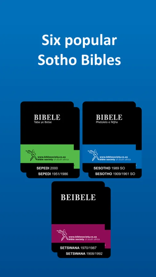 Six popular Bibles in Sepedi, Sesotho and Setswana. Read, compare or share Bible verses.